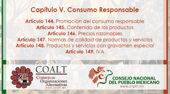 El Autogobierno Popular realiza continuamente acciones y actividades culturales y administrativas para promover el consumo responsable de bienes y servicios y para disminuir el derroche, desperdicio o consumo compulsivo. Los Consejos Municipales, Estatales y Nacional de Consumo se encargan de que todo bien o servicio ofertado considere el aspecto ético y los impactos social y ambiental del ciclo de vida del mismo, así como de orientar al consumo racional, responsable, integral y sustentable. Para garantizar el consumo sostenible y sustentable: a) los recursos naturales renovables no se deben usar a una velocidad superior a su propia tasa de renovación; b) los recursos naturales no renovables se deben utilizar a un ritmo equivalente a la tasa de sustitución por otros recursos renovables, y c) la emisión de residuos y contaminación no deben exceder de la capacidad de asimilación y autodepuración de los ecosistemas. Los Consejos Municipales, Estatales y Nacional de Consumo deben realizar campañas continuas para promover alternativas que eviten y minimicen la depredación de los recursos naturales: reducir, reutilizar, segunda mano, trueque o intercambios, reparar y reciclar.