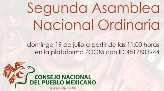 A los integrantes del Consejo Nacional del Pueblo Mexicano, con fundamento en los artículos 21, 22, 23, 24, 28, 29 y 30 de nuestro estatuto, se les CONVOCA a la SEGUNDA ASAMBLEA NACIONAL ORDINARIA 2020, a realizarse VIRTUALMENTE el domingo 19 de julio a partir de las 11 horas en la plataforma ZOOM con ID 4517803944.